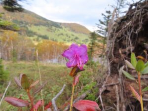Written by 然別湖のほとりから(自然情報) 10月3日 たにっこ 2025.10.03 Post Share Hatena Pocket RSS feedly Pin it 秋深まる東雲湖。だいぶ紅黄葉も進み見通しも良くなってきました。 その中で目立つのはエゾイソツツジと エゾムラサキツツジ。 この時期に花が咲いています。 毎年東雲湖近辺と駒止湖のガレ場では咲くので もはや狂い咲きと言うよりは二期咲く?