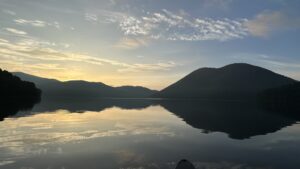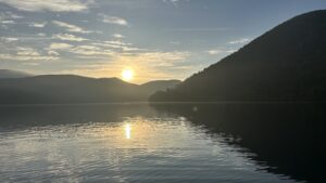 日の出を迎えた湖上。