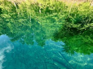 水鏡に映る湖畔の森と透明度の高い湖水。