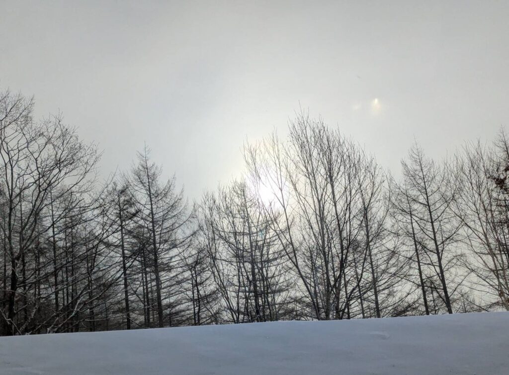 Written by 然別湖スタッフ日記 2月13日 えー子 2026.02.13 Post Share Hatena Pocket RSS feedly Pin it 朝日がぼんやり見える今日は、遠くから飛んでくる粉雪が太陽の光を滲ませています。 いつもは刺すような光で目がくらむ出勤途中の坂道ですが、 穏やかな白い風景に木の枝の透かし模様がキレイで車を停めて写真を撮ってしまいました。