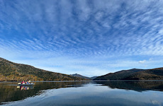 教練在湖畔教學完後划到然別湖另一邊東雲湖入口。